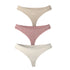 Conjunto de tres panties bikini en colores nácar, polvo rosa y piel. Estos bikinis ofrecen una cobertura cómoda y un ajuste suave, ideales para el uso diario. Con tonos neutros y delicados, son perfectos para quienes buscan un look natural y elegante en su ropa interior. Compuesto por 96% algodón y 4% elastano.